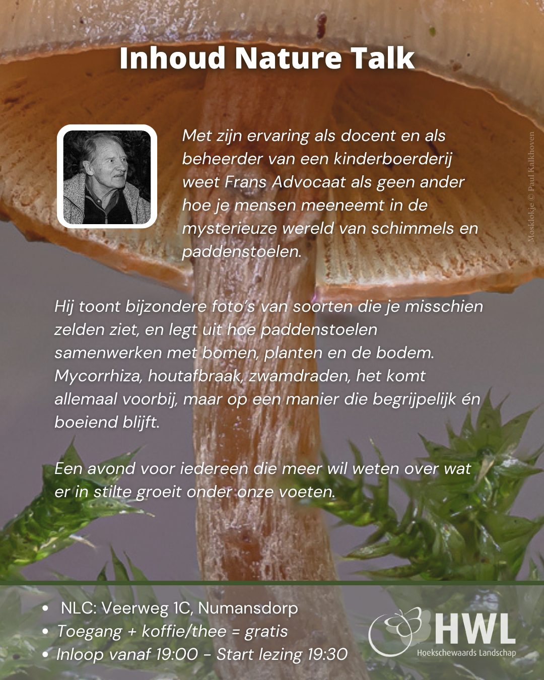 Met zijn ervaring als docent en als beheerder van een kinderboerderij weet Frans Advocaat als geen ander hoe je mensen meeneemt in de mysterieuze wereld van schimmels en paddenstoelen. Hij toont bijzondere foto’s van soorten die je misschien zelden ziet, en legt uit hoe paddenstoelen samenwerken met bomen, planten en de bodem. Mycorrhiza, houtafbraak, zwamdraden, het komt allemaal voorbij, maar op een manier die begrijpelijk én boeiend blijft. Een avond voor iedereen die meer wil weten over wat er in stilte groeit onder onze voeten