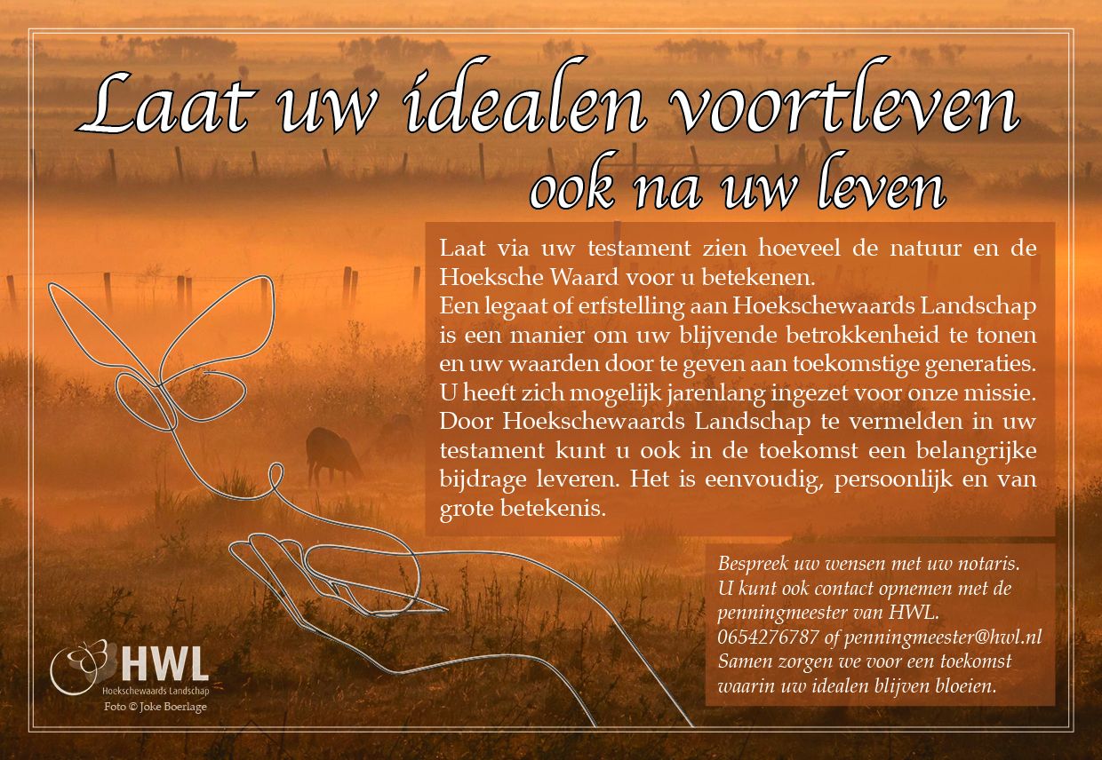 Laat via uw testament zien hoeveel de natuur en de Hoeksche Waard voor u betekenen. Een legaat of erfstelling aan Hoekschewaards Landschap is een manier om uw blijvende betrokkenheid te tonenen uw waarden door te geven aan toekomstige generaties. U heeft zich mogelijk jarenlang ingezet voor onze missie. Door Hoekschewaards Landschap te vermelden in uw testament kunt u ook in de toekomst een belangrijke bijdrage leveren. Het is eenvoudig, persoonlijk en van grote betekenis. Bespreek uw wensen met uw notaris. U kunt ook contact opnemen met de penningmeester van HWL.